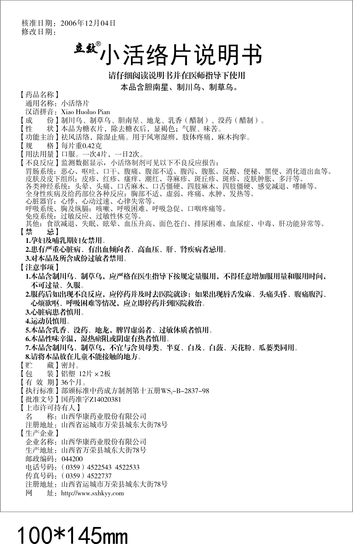小活络制剂说明书修订告知书